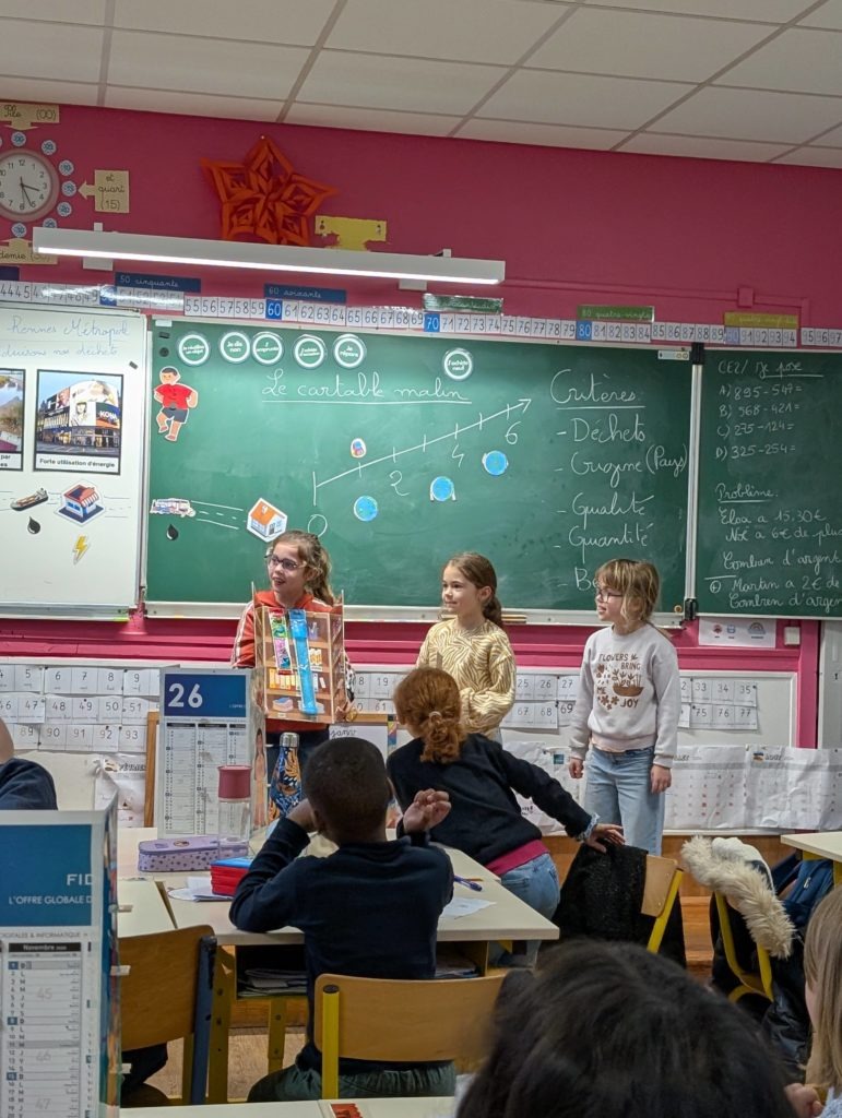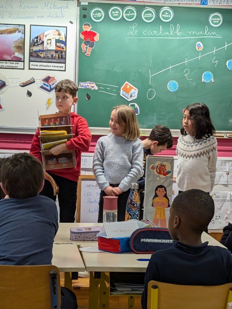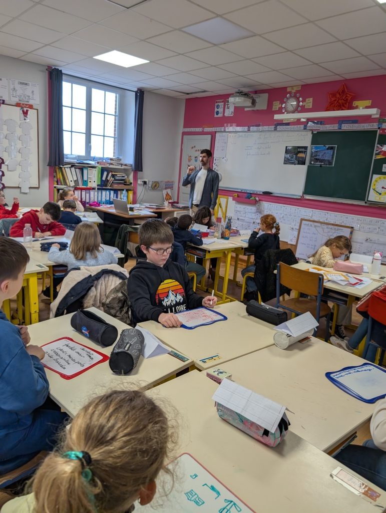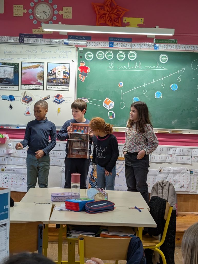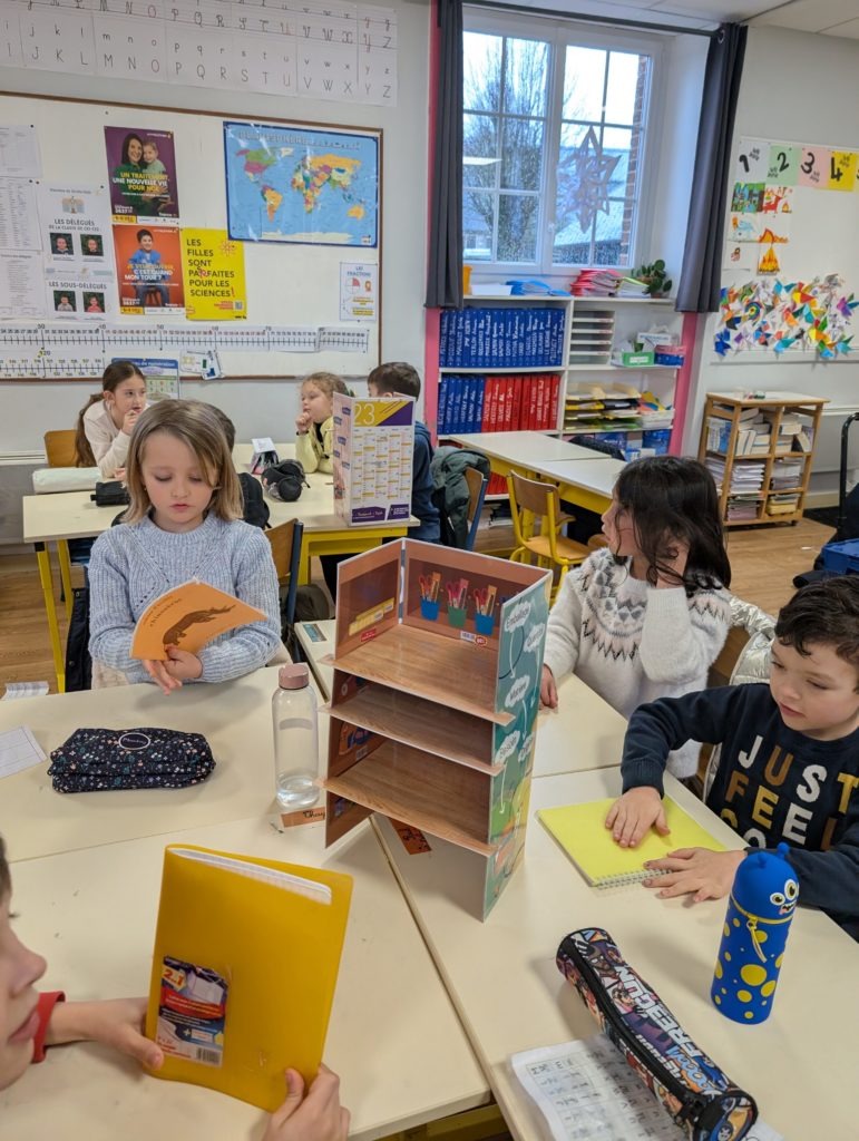 Cet après-midi, les élèves de CE1-CE2 ont reçu une animation de la Feuille d’Erable pour la consommation responsable avec Fabien. Dans leur mini magasin, ils ont pu choisir les fournitures de classe les plus responsables parmi 3 choix. Enfin, ils ont terminé la journée en créant un petit carnet de dessin en réutilisant du matériel qui ne servait plus : feuilles de brouillons, chutes de papiers cartonnés, fil.