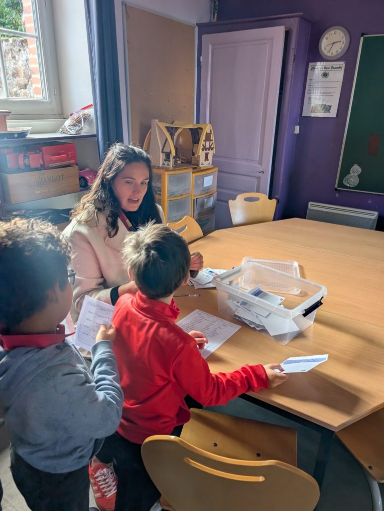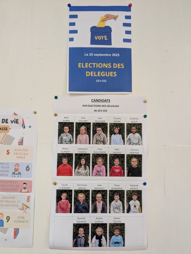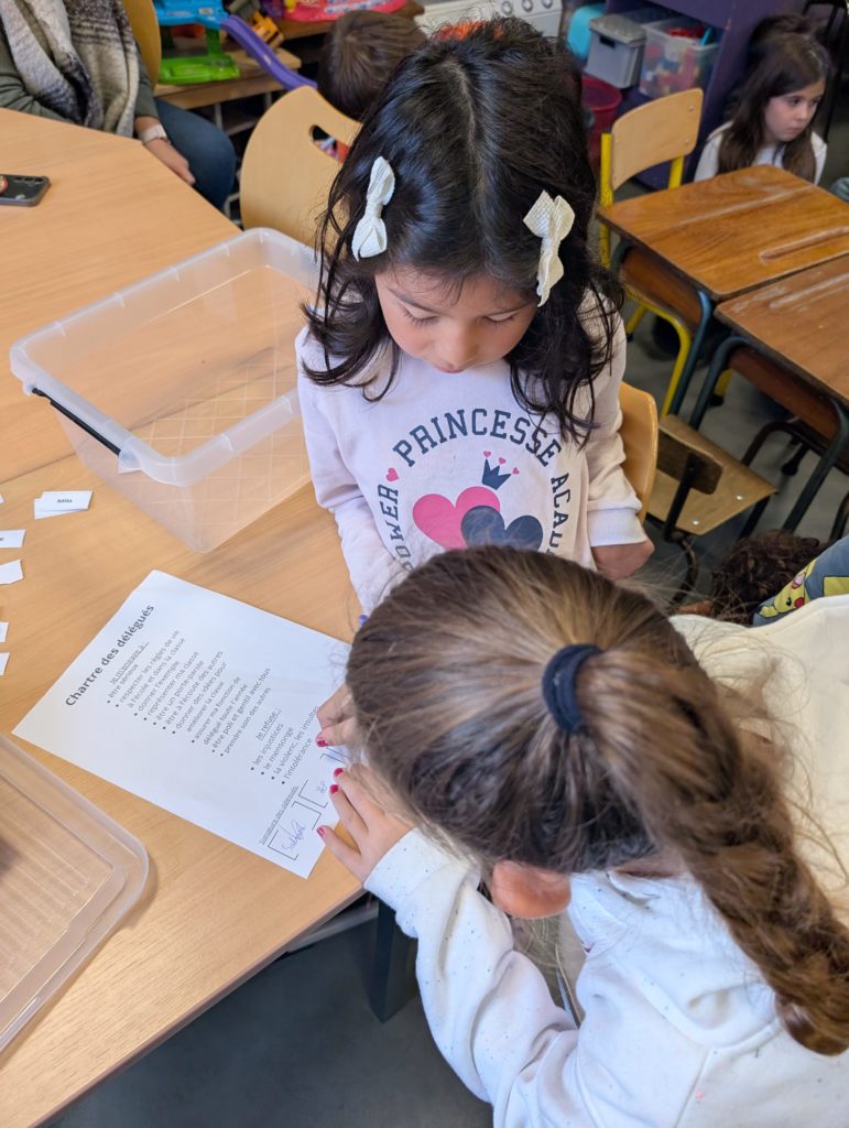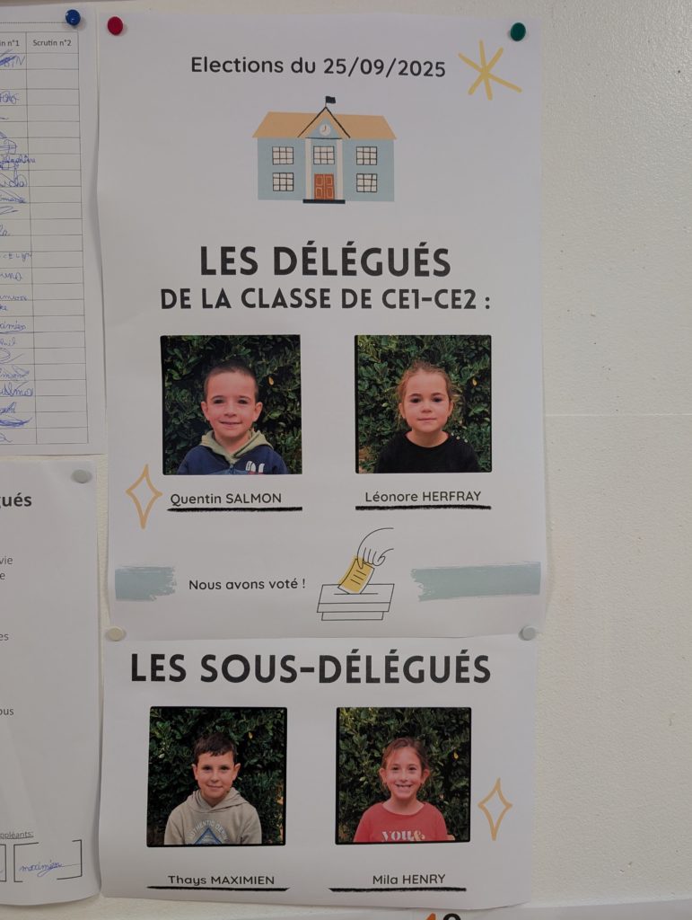 Cette semaine, l’objectif était d’élire des délégués. D’abord, chaque candidat s’est présenté en tenant un petit discours devant la classe. Puis le jour du vote, chacun a pris sa carte électorale pour aller au bureau de vote, se placer derrière l’isoloir et signer la fiche d’émargement en posant son enveloppe dans l’urne. Résultat : une CE1 et un CE2 en délégués et en sous-délégués !