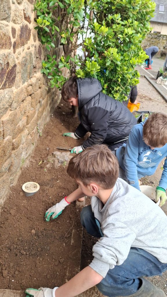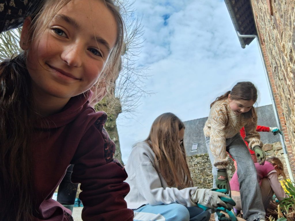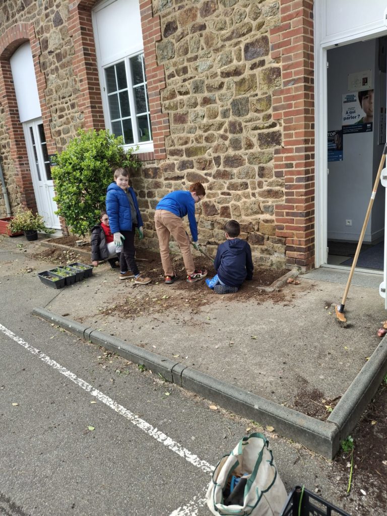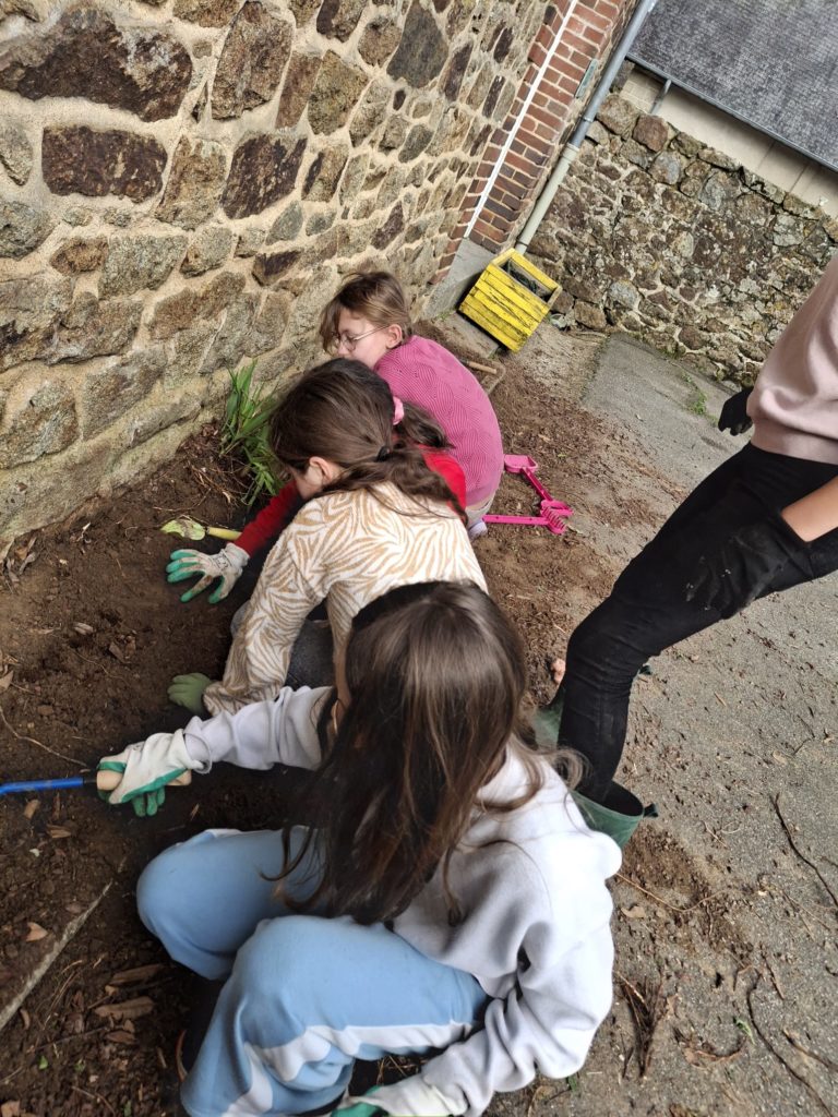Les élèves de la classe se sont définis un tout petit espace dans la cour de l’école pour embellir la cour de récréation. Après un temps de nettoyage de ce carré vert assez fastidieux, ils ont appris à planter des bulbes de glaïeuls et des graines de fleurs vivaces. Ce fut l’occasion d’ancrer une séance de sciences très concrètement en lien avec des mathématiques et du vocabulaire. Les élèves étaient contents de ce temps rempli de sens. Désormais, ils vont veiller à ce que leur petit espace vert soit bien entretenu pour que les conditions de pousse soient optimales.