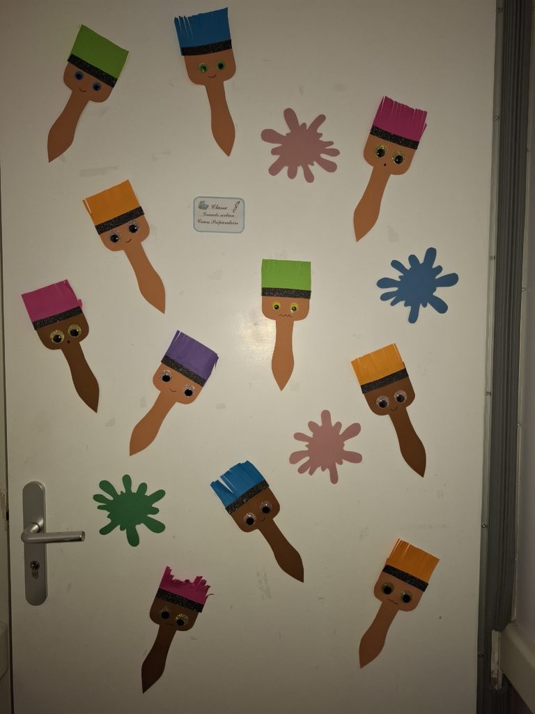 Lors de la garderie à La Chapelle Chaussée de la première période , Marie et Patricia ont proposé aux enfants de décorer les murs et les portes des couloirs avec des petits pinceaux. Belle réussite.