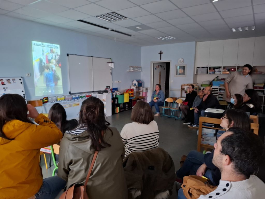 Cette année, elles ont souhaité changer de format. Les réunions n’ont pas été transmissives. Des ateliers étayés de petits films de vie de classe ont permis d’organiser ce temps de façon très concrète. Pour les CM c’était plus la thématique des méthodes et devoirs qui ont été partagés avec les parents alors qu’en maternelle, c’est le film d’une journée d’école qui a été la point d’accroche aux questions des parents.